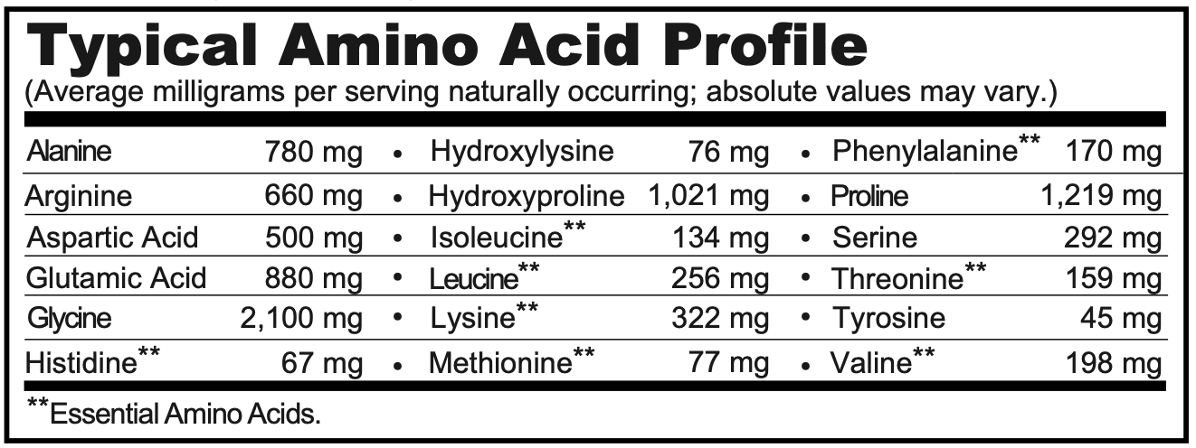 Below is the amino acid profile for the Multi Collagen Protein Powder, shown in milligrams per serving. These values represent naturally occurring amounts and can vary because collagen is a food-based ingredient. As formulas evolve over time or sourcing changes, any updates will always be reflected on the current Supplement Facts panel.